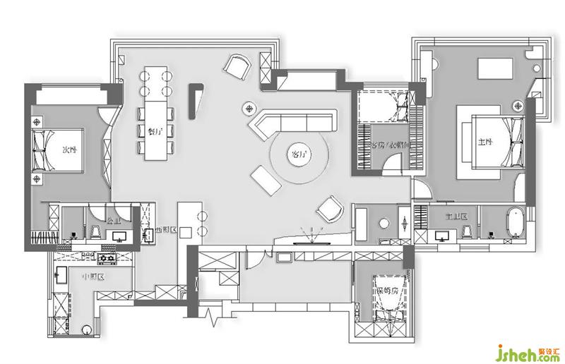 ③增:借用次卧部分面积拓宽公卫,在保留了公卫原本入口的基础上,增加一扇通往卧室的门,公卫也是次卧的套卫