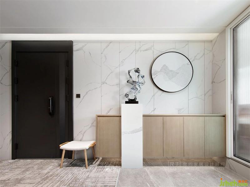 出电梯后是一个宽阔的门厅,竖线条分割的瓷砖墙面上悬挂着定制的手绘山水油画,白色的中柱造型与其上的摆件将鞋柜切割,灰白木三色地构成了这个有序空间。