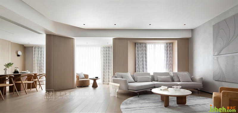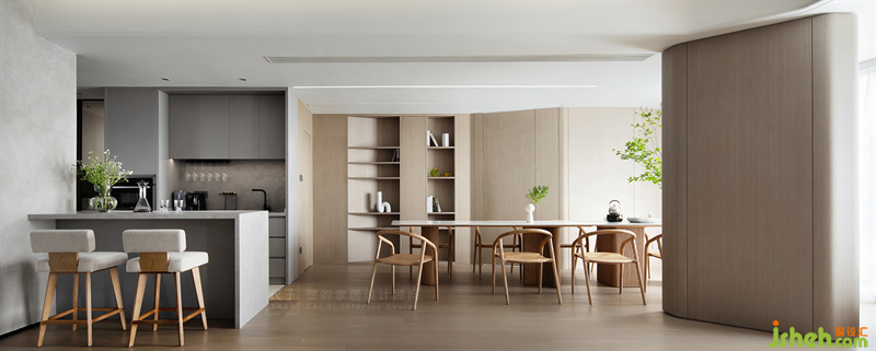 公共区域是一个整体,天花流畅的弧度展现出几何的秩序与美感,木色、灰色的色块与材质过渡应对空间的功能划分。