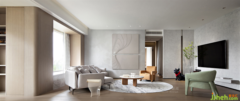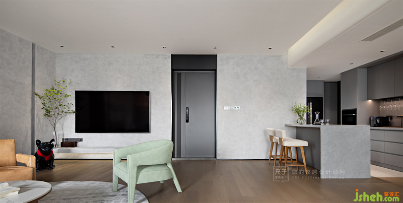 灰色艺术涂料奠定空间宁静的基调,浅松石绿与淡黄的单人沙发丰富着客厅的色彩感知,装修设计以细微处的变动打破沉闷,构建出轻松舒适、愉悦惬意的氛围。