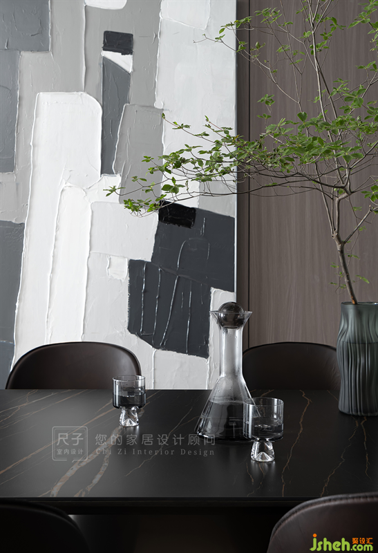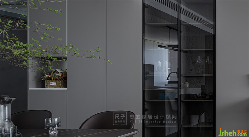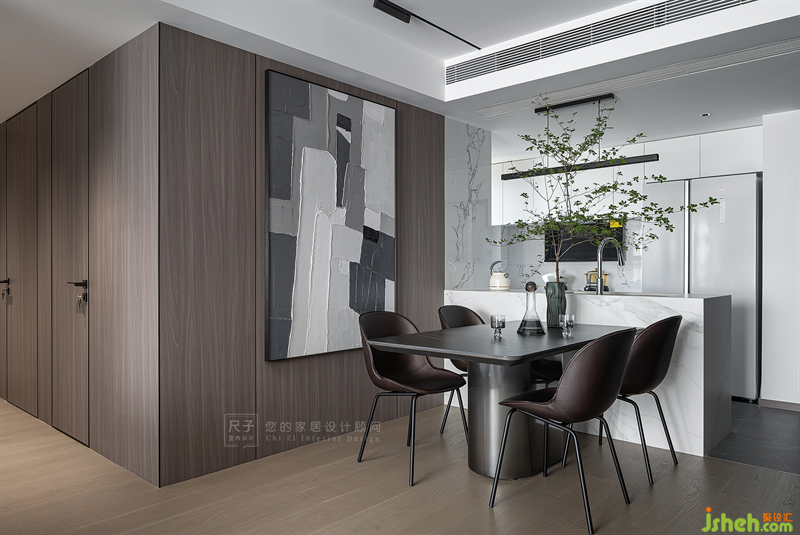 以岩板、玻璃以及木饰面板等材质的碰撞,来诠释空间质感