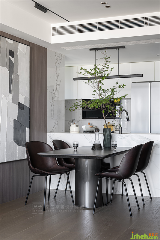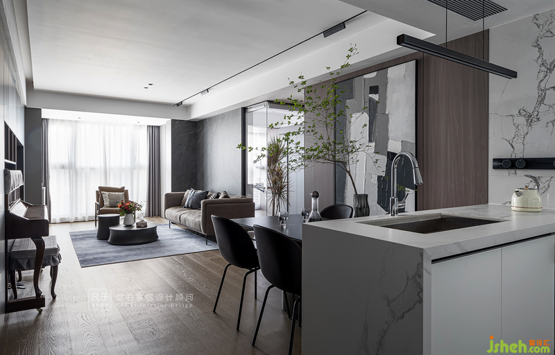 将厨房从传统的封闭式格局中解放出来,以此改善空间采光和通透感,保持空间的流动性