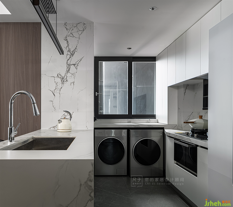 纳入了生活阳台后的厨房,空间变得更加开阔,同时保留了洗衣烘干功能。