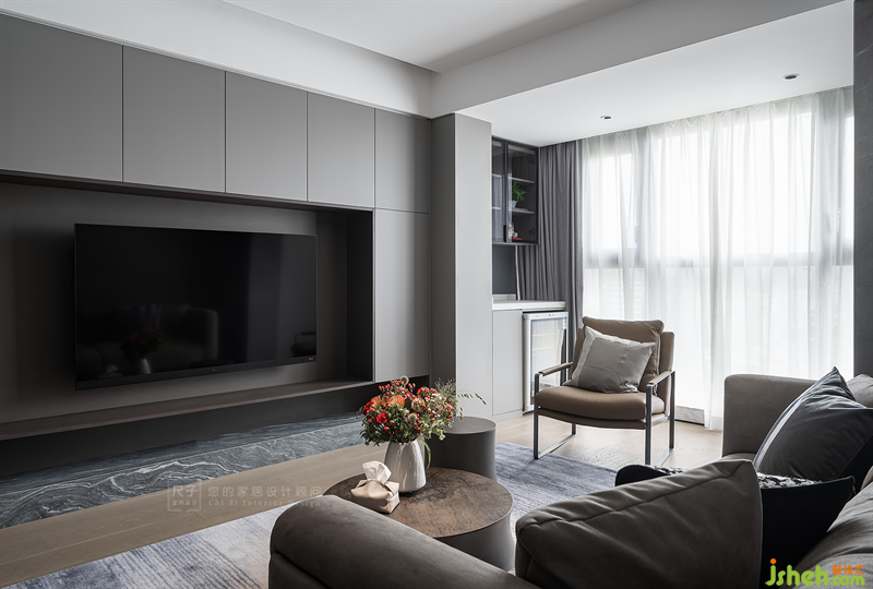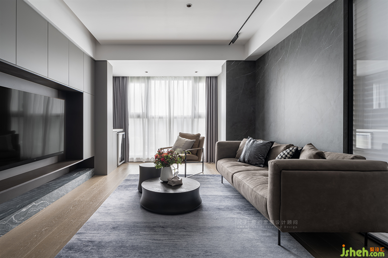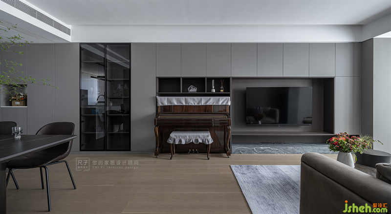黑白灰与木色交替,足足8米长的储物柜,将屋主对功能性与艺术感的追求融合;暖咖的皮质沙发与柔软的地毯,交织出空间的高级气质,又不失家的松软舒适感。