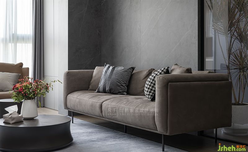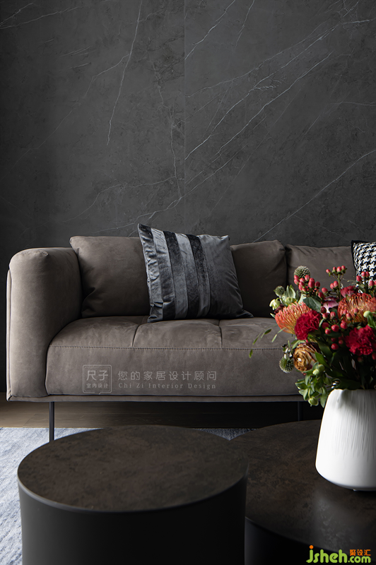 基于业主喜欢的低调配色与高级质感,我们以灰色岩板与通透的玻璃碰撞出一面独特的沙发背景,低调细腻中形成和谐反差。
