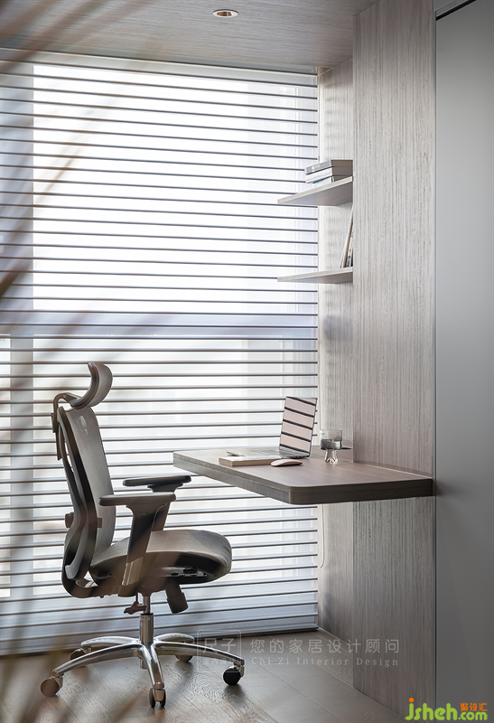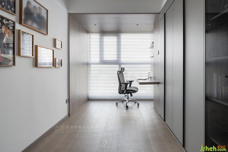 沙发玻璃墙背后便是半开放式的书房,原本的阳台位置纳入室内,天花与墙体以木饰面板包裹,围合成一方工作区。