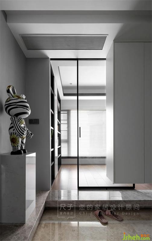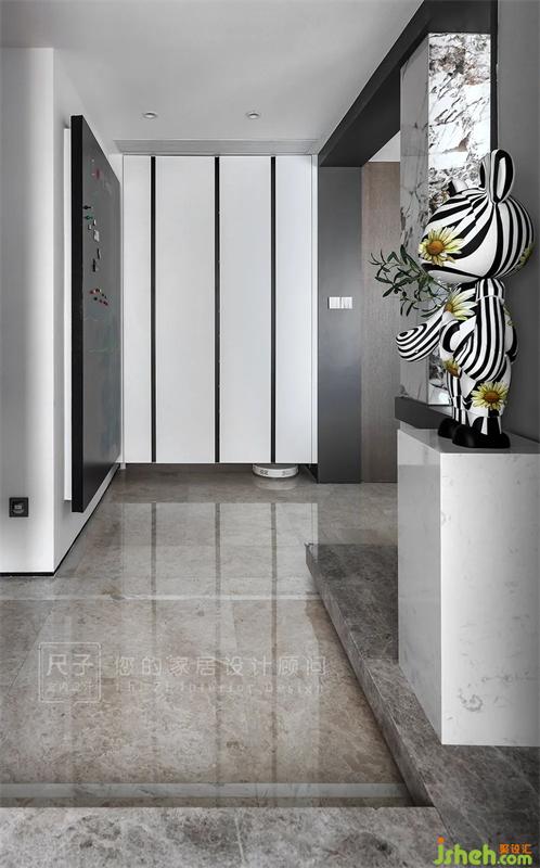 我们将原玄关与客厅相连的墙体、隔断书房与玄关的柜子,深色的大理石及复杂多层的天花全都拆除。