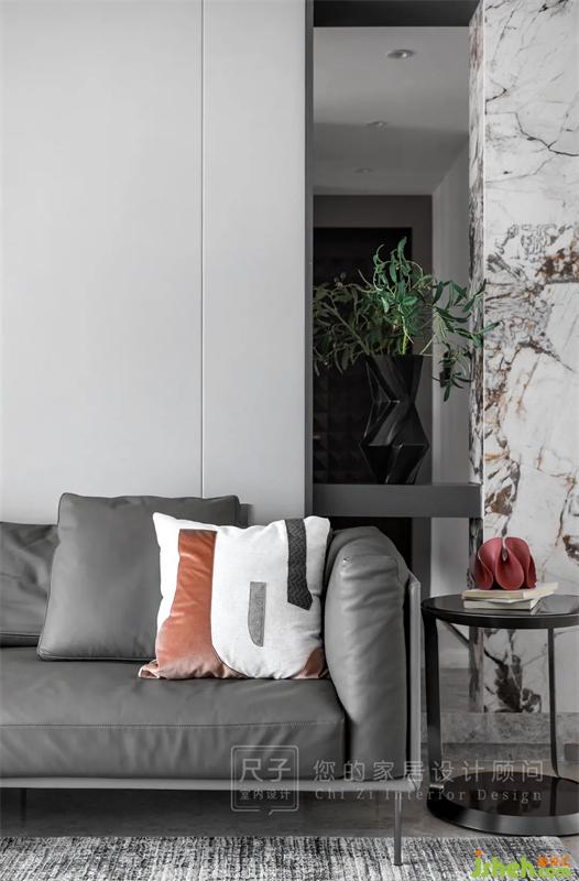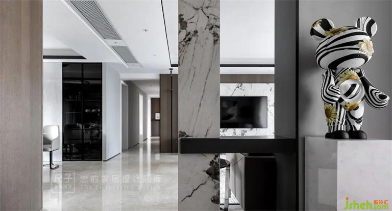 装修设计将客厅与玄关相连的墙体,无疑是将沙发背景墙缩短了,巧妙地利用镂空和深色门套,视觉上将背景墙做了延伸,花色柱子倒成了独特的装饰。