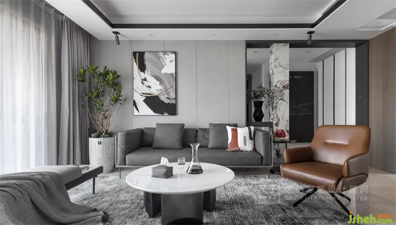 浅色的硬包与深灰色的沙发形成深浅有致的对比,棕色的单人沙发、抱枕加以点缀。