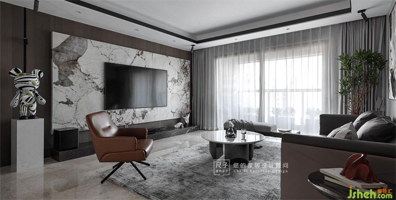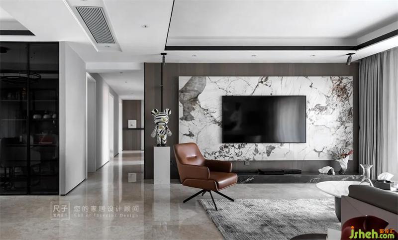 电视墙的岩板,是玄关柱子材质的延伸,与素净的木饰面形成对比,不过于花哨,却不失亮点。