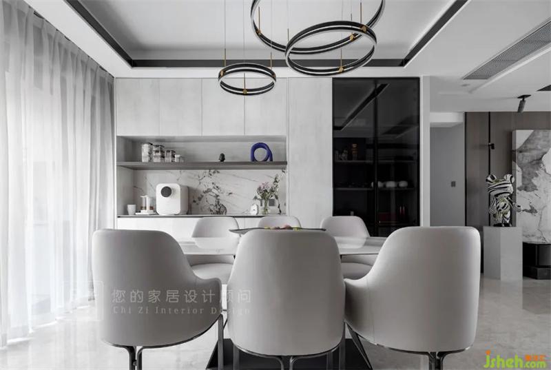 主人原想在餐厅摆放圆桌,但又想有一个餐边柜可日常操作咖啡机等小电器,几番权衡下,最终采用了长餐桌与餐边柜结合,餐边柜分成展示区与操作区,主人爱茶,家中大大小小的茶罐也有了合适的地方摆放。