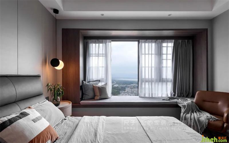 床头增加小吊灯、壁灯、竖向灯带等氛围光,丰富空间灯光层次。利用木色护墙板将飘窗划分成一个大人与小孩互动的地方。