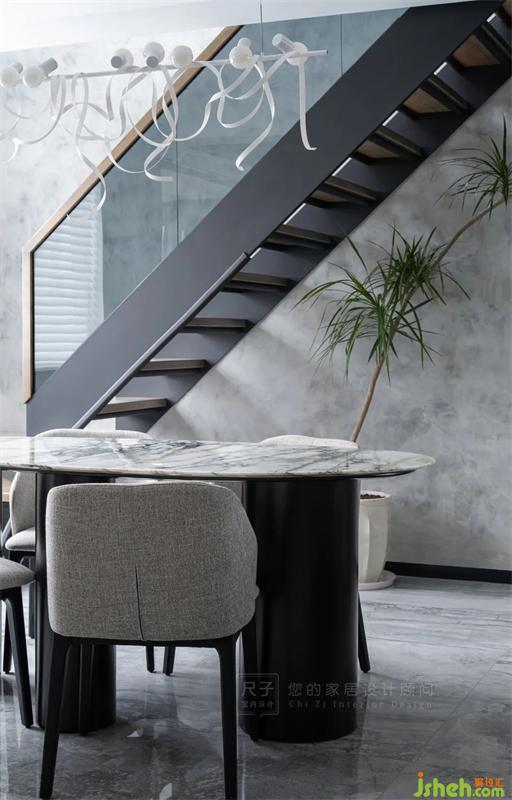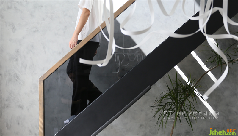 顶楼复式设计楼梯是动静分区的过渡地带,黑色钢架结构与灰玻的搭配,简约亦有质感,木色踏板与扶手则展现着空间的温柔与暖意。