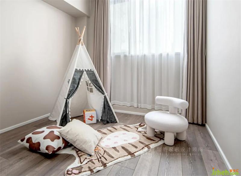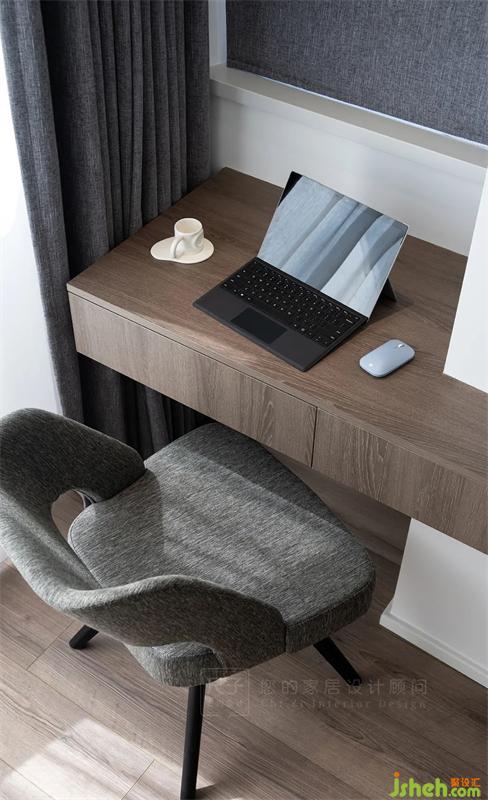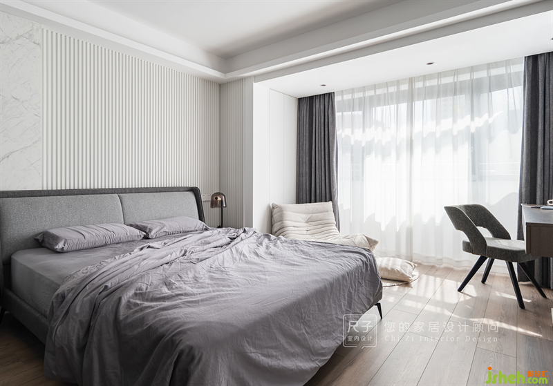 主卧以套房形式设计,更注重实用和舒适性。封了阳台作为休闲+阅读学习区;睡眠区的床头背景墙是岩板+波浪板的造型,清新明快,简约却不乏质感。