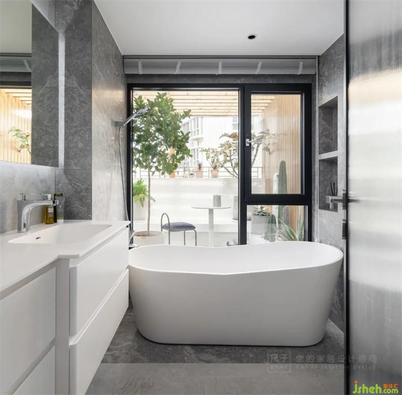 顶楼复式设计主卫向阳台方向进行了扩充,临窗砌置了一个大浴缸,通透的玻璃将阳台的风格带入洗浴空间,尽显品质生活。