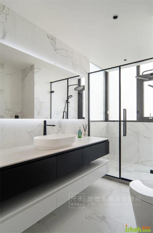 公卫同样是一个高颜值的空间,纹理感十足的墙面、皓白的台面、黑白的抽屉,由浅到深的材质递进,建立明晰的功能层次。