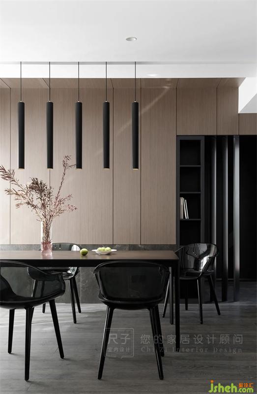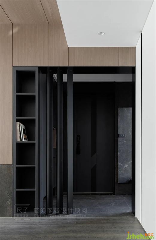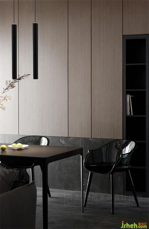 入户处的不锈钢屏风,每一根独立的柱体,都是活跃的内在张力;饰面板从墙面延伸至天花,让整个空间更显大气挺拔。