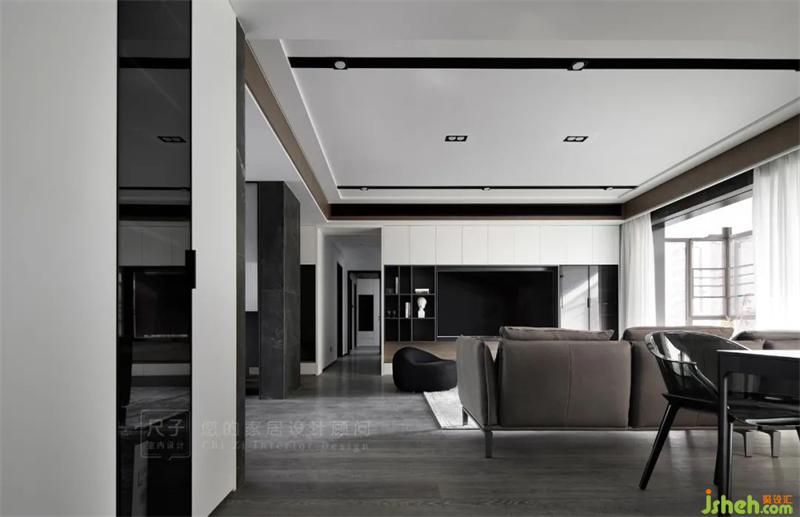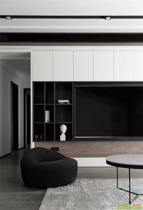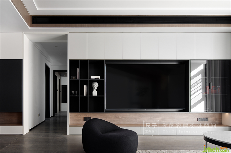 电视背景与同一平面上的公卫收纳柜,装修设计在造型以及色彩上形成统一,冷静且克制,高雅又耐看。