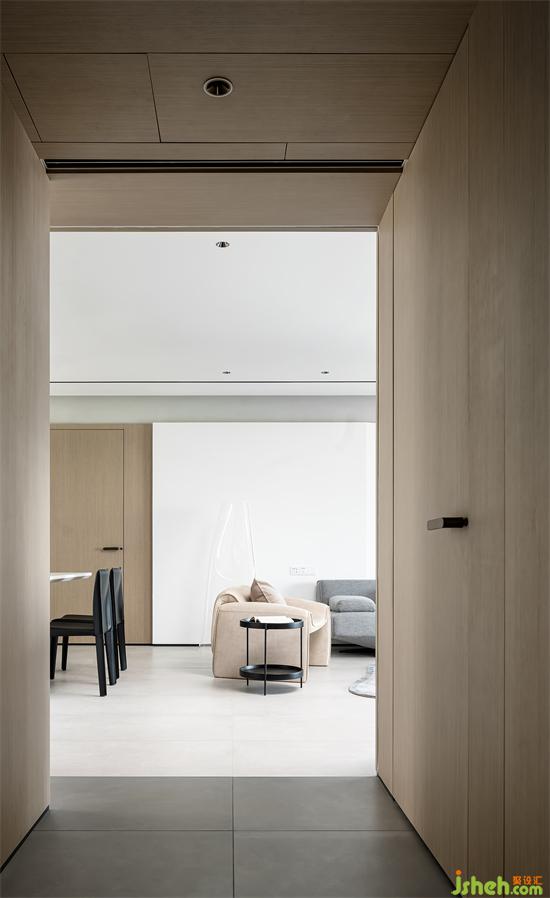 玄关是重要的过渡空间,深色的瓷砖结合木质天花,我们用一个“木盒子”将玄关区域清晰界定出来,深圳家装设计让人真切感受到从户外回到了自己的私人领地。