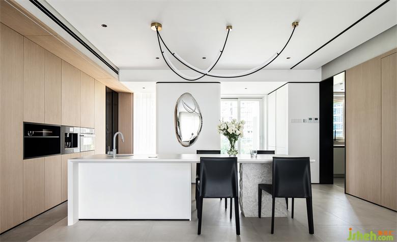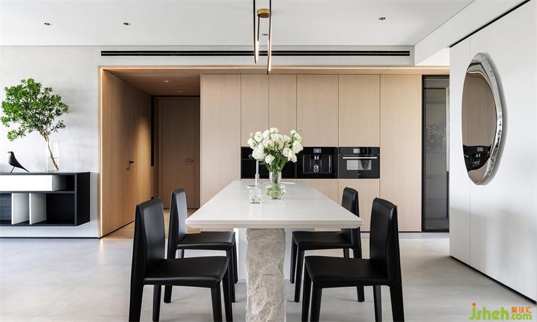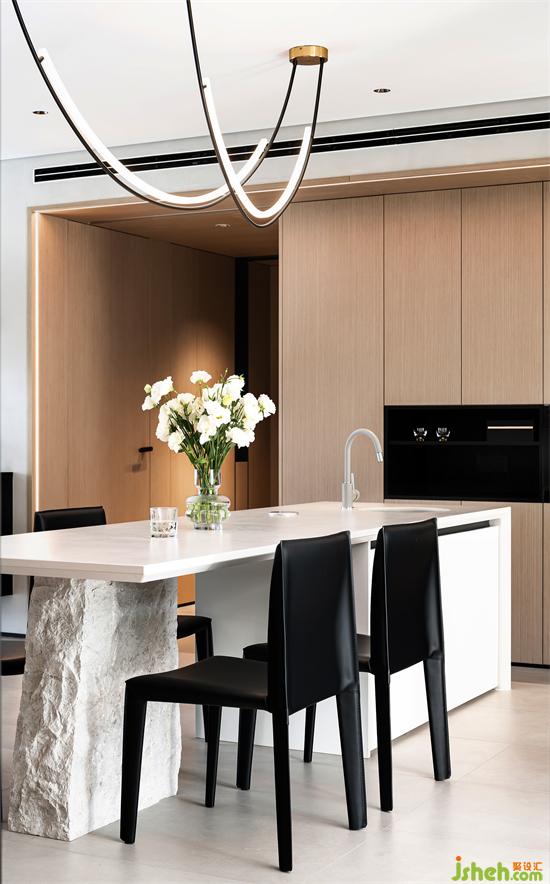 餐桌与吧台一体,纯白色的岩板桌面下是天然的石头支撑,足够长的台面,深圳家装设计丰富了原本单一的功能属性,整排储物柜则满足了公共区的收纳需求。