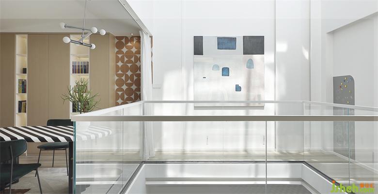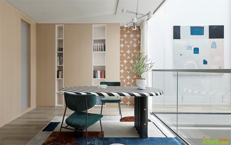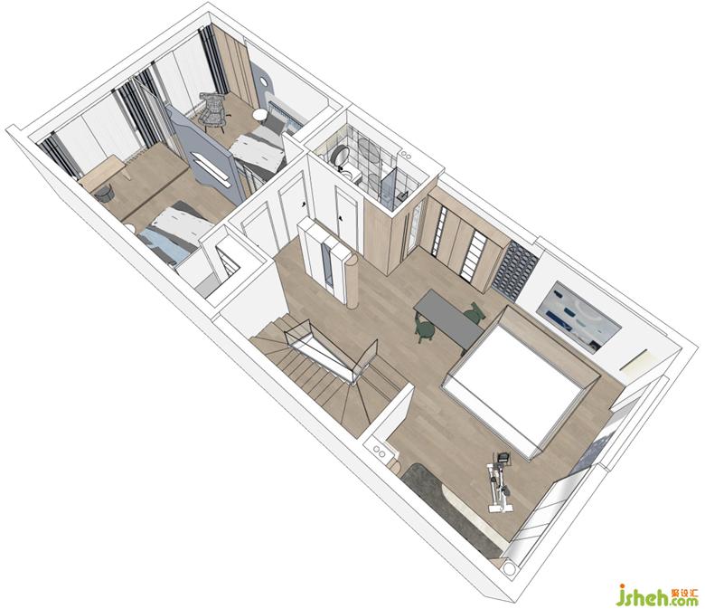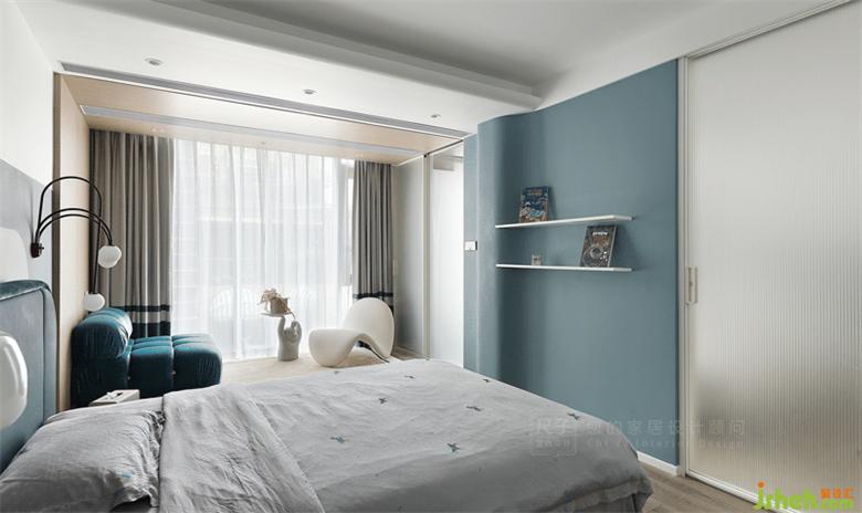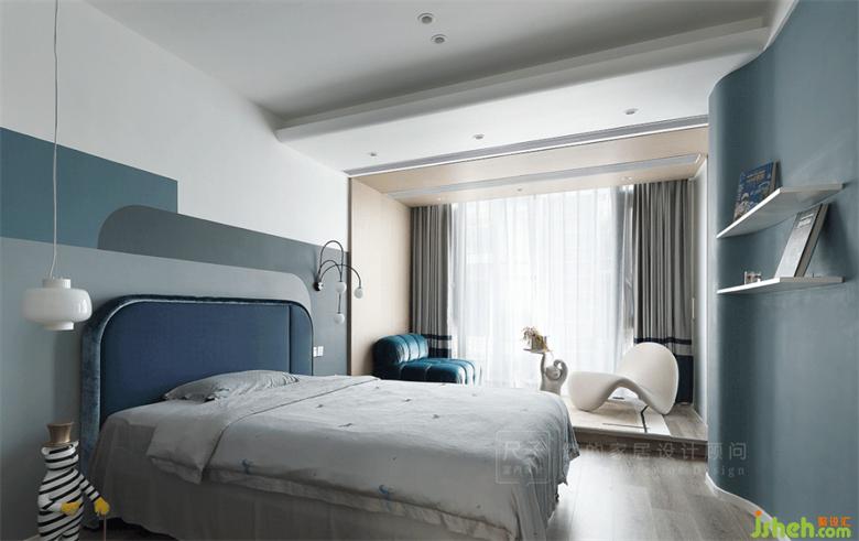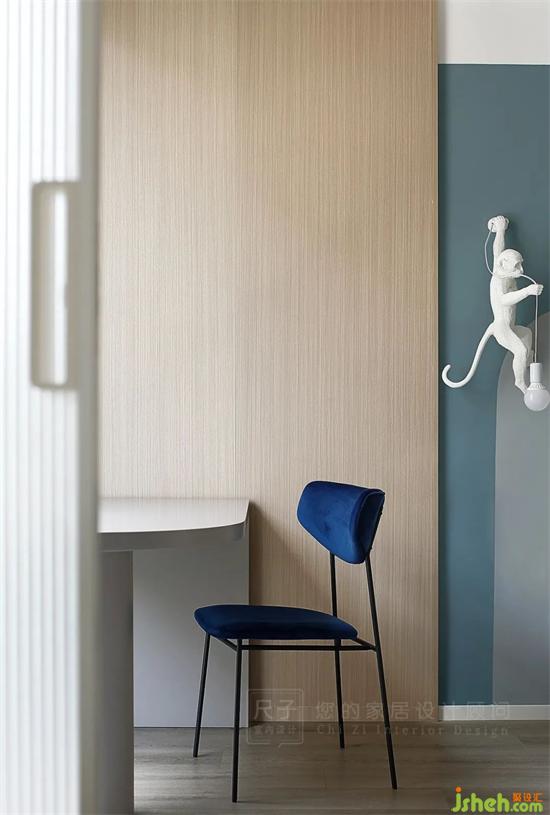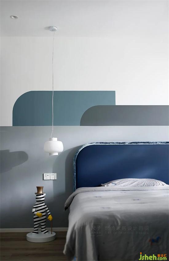 另一头是孩子们的卧室,高级灰做底,蓝色加以点缀,深圳联排别墅设计色块组合让空间更具灵动层次感。