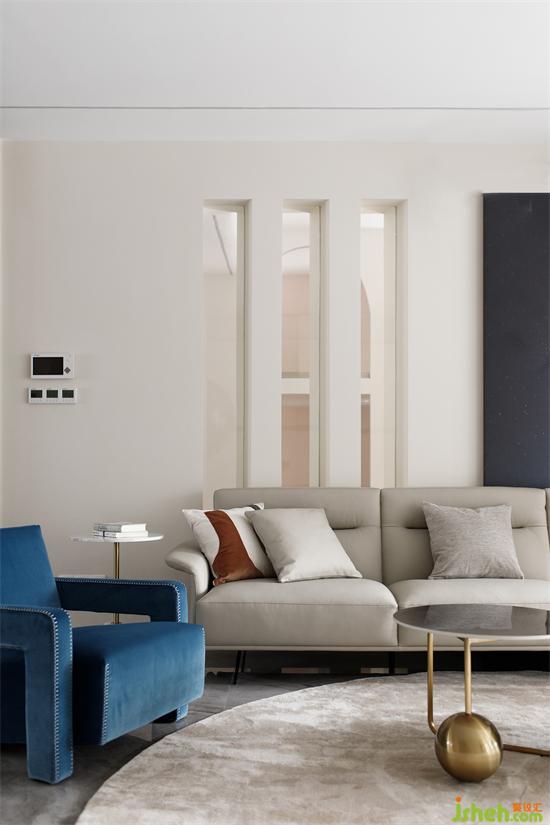 透过沙发背景的小条窗,家长在客厅也能时刻照看到嬉戏玩闹的孩子们,两个空间既联系又不会互相影响。