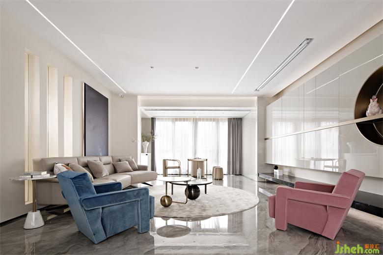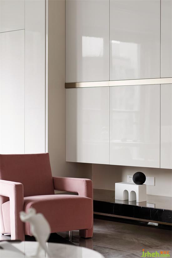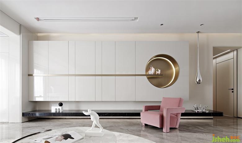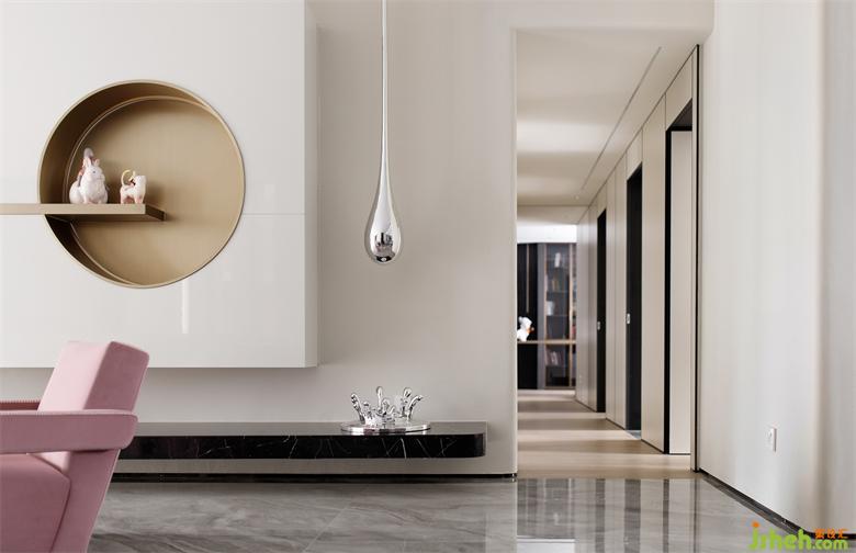 客厅储物柜兼顾储物和造型感,横线条犹如人生的翘翘板,是这个家支撑了两个小女孩的成长。深圳家装设计白夜童话小女孩摆件、水滴的装置、单人位沙发一粉一蓝的搭配,餐厅的双环镜子、都围绕其中。