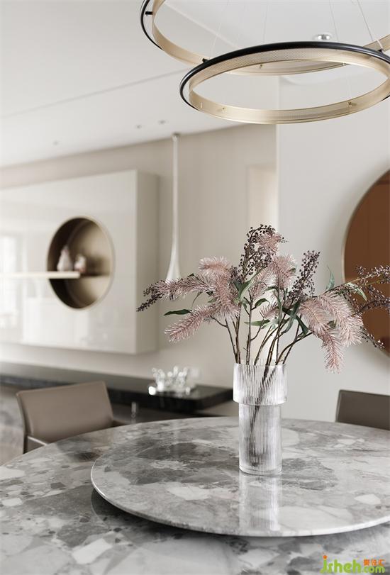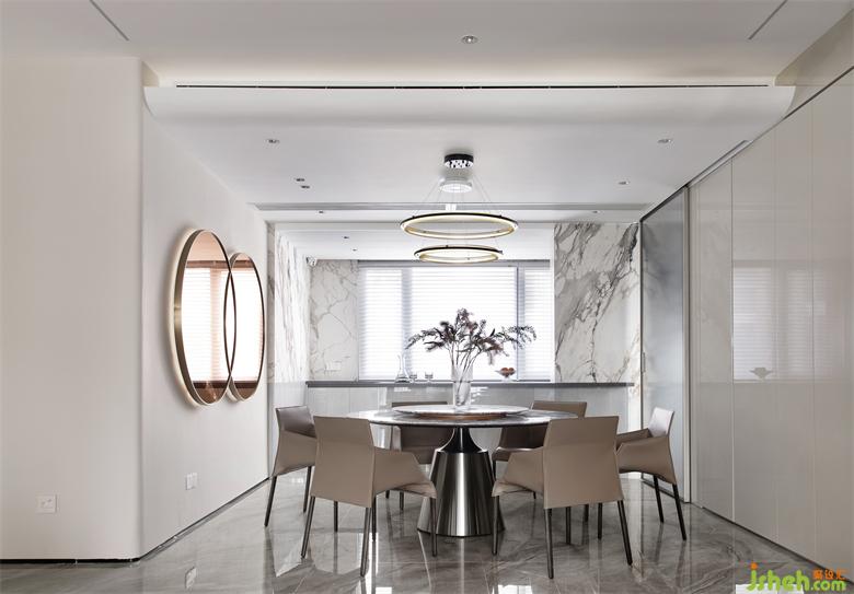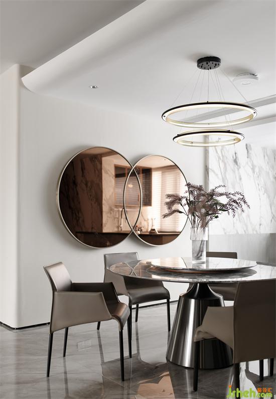 弧形线条遵循一定韵律延伸至餐厅,圆形元素在家具配饰上的运用,深圳家装设计让整体氛围清冽的餐厅多了丝丝柔和的感觉。