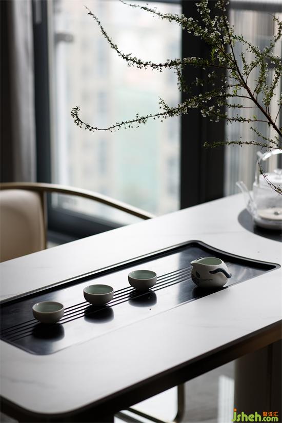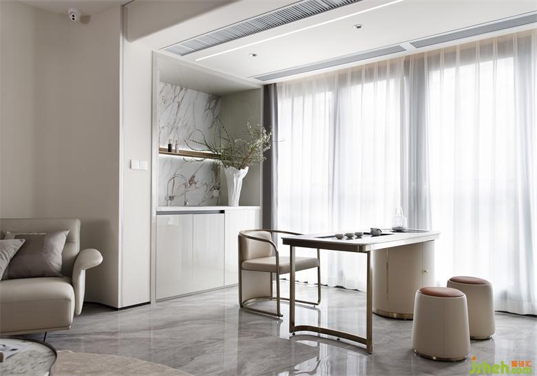 公共空间以浅奶咖色为主体色调,遵循业主大家庭理念,将客厅、餐厅、茶区、西厨区相连的视觉特点,带来阔达的空间尺度,加上大面积的落地玻璃,更显大气。