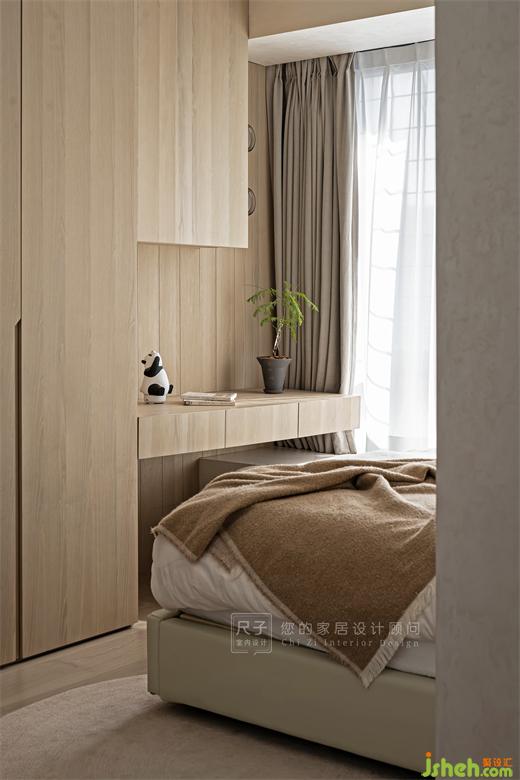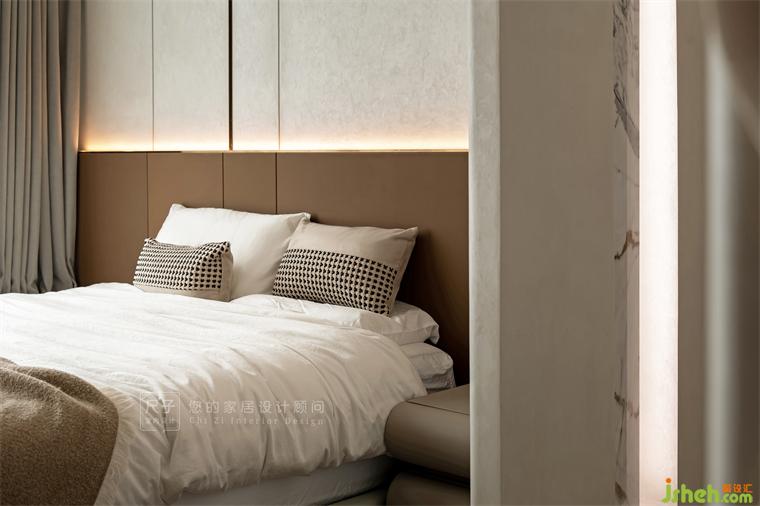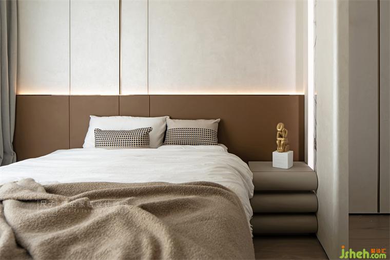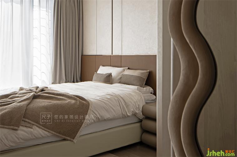 主卧半隔断巧妙成为两处区域的间隔点,腾出更多的活动空间,又保证隐私的尺度;装修设计吊顶弧形的设计通过艺术涂料的自然纹理,打造空间的流动质感。