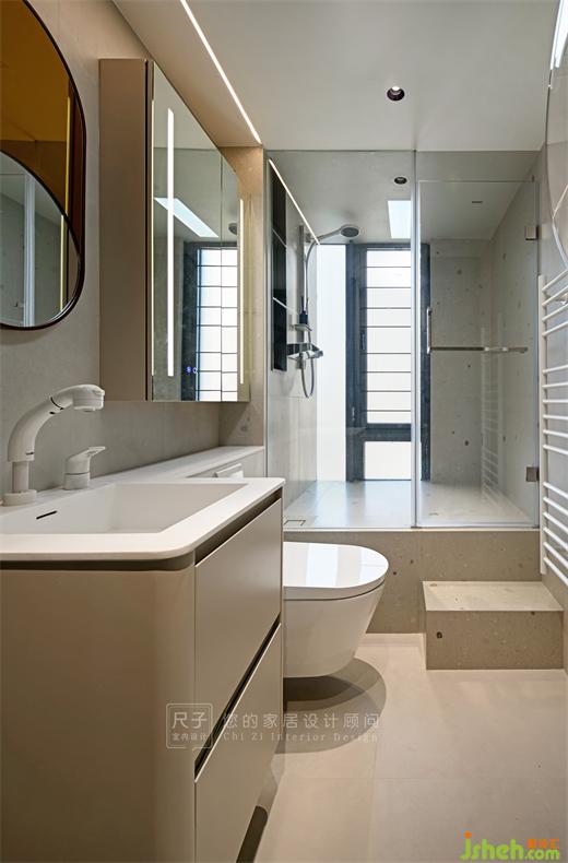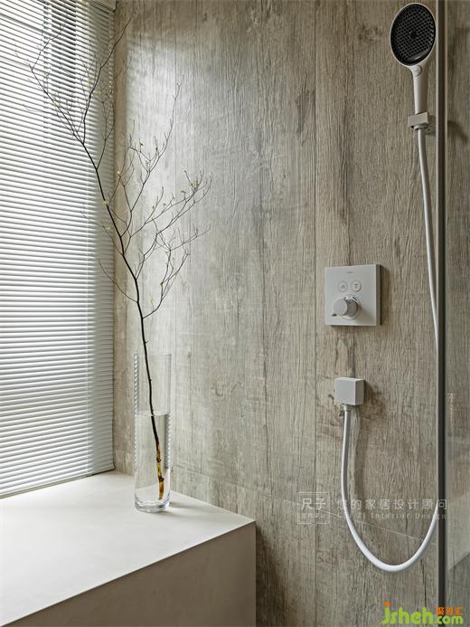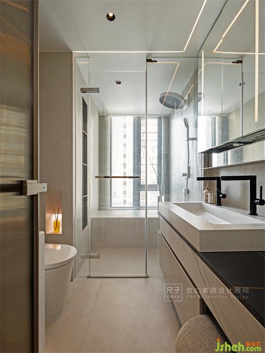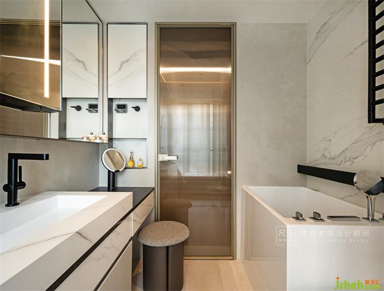 主卫整体开阔通透,线性灯带暖光与岩板一冷一暖的碰撞,高级又美观,装修设计阳光在淋浴房墙面晕染成更加细腻迂回的光影。