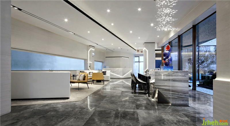 空间中的光线,透过景观幕墙与天花、墙面相辉映,最终在大型装置的吊灯中流转,转而出现的是一种超越线性的延伸,可并存、恒久,成为光对空间的极限表意,而形成瞬间的焦点。