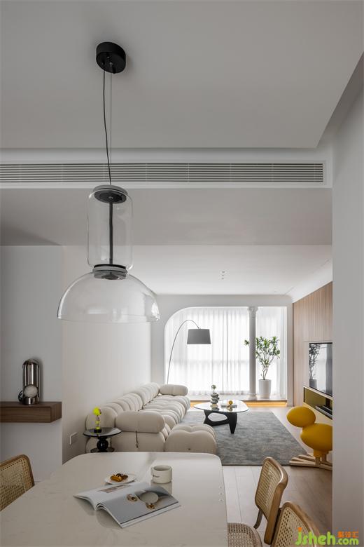 桌子上方,吊灯垂落而下,选材考究,流畅的外形自带动感,简洁有力、静默无声,利落的线条轮廓让一日三餐充满仪式感,童趣的潮玩艺术品又为家居增添了生活气息。