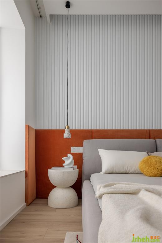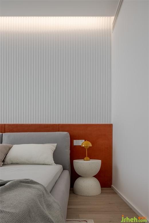 格栅元素结合色彩跳跃的橘黄色背景,在空间中成为整体视觉焦点,让人眼前为之一亮;选用纱质窗帘,恰如其分地为住宅引入自然光,在最大限度的保证隐私的同时,在光影的渲染下呈现出温馨、舒适的质感。