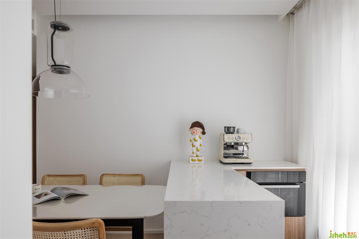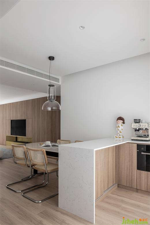 开放式的厨房与餐厅、客厅巧妙融合,天津天霖园装修设计最大化利用屋内空间,使各个区域极具关联又互不干扰,增强了餐厅与厨房的互动性。
