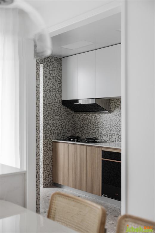用不规则的瓷砖图案设计厨房背景墙,美化了烹饪区墙壁的同时,其灰白跳跃的色彩也活跃了空间的氛围。让空间充满活力和生机。