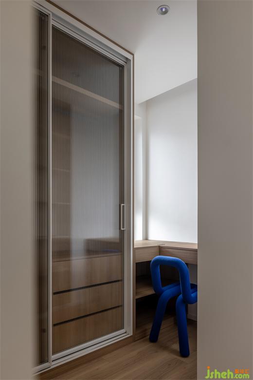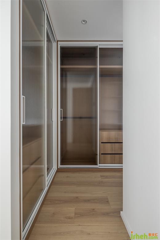衣帽间设计颇具巧思,用极其简单的线条勾勒出最具灵性的空间。嵌入式的木纹柜体,最大限度地深化了使用空间,天津天霖园装修设计选用长虹玻璃作为衣柜的柜门,保证了防尘效果的同时扩大了视觉的张力。