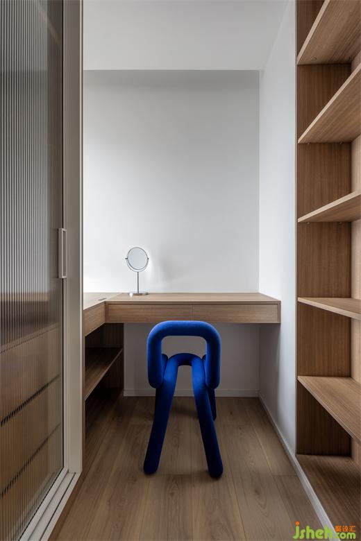 在衣帽间内设置独立的化妆台,相对独立的空间可以让家居生活变得更为惬意。蓝色的梳妆椅搭配木质桌面给人以色彩的冲击,天津天霖园装修设计整体造型简洁优雅、干净利落兼具现代美感,展现优雅惬意的品质生活。