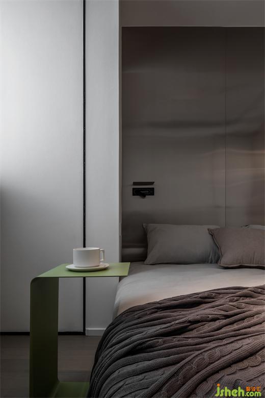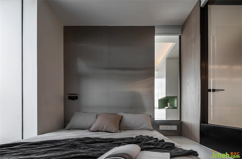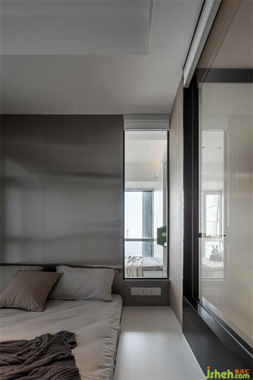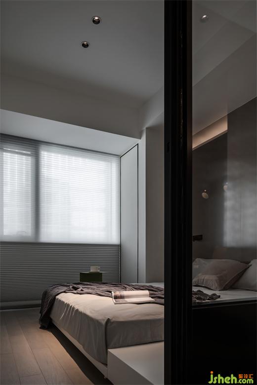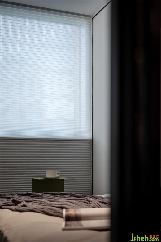 卧室颜色以白、灰为主卧室背景墙面采用拉丝不锈钢的反光材质,既是一种装饰,也能呼应金属的现代摩登,与现代简约风格形成强烈视觉反差。同时我们将主卧室与儿童房之间做了一扇窗,既可以增加主卧的采光,又可以让父母第一时间关注到孩子的成长与安全。随着孩子慢慢长大并对隐私性有要求的时候,我们也贴心的将这扇窗增加了蜂窝百叶功能,随时随地根据居者需求调整光线及隐私。