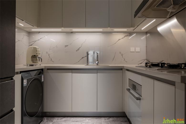 餐厨空间以“一动到静”的手法,为现代设计注入优雅的意趣与韵味。开放式的厨房以纯白为主色调,简约干净,在自然中回归质朴,天津和平翰林公馆装修设计摒弃繁复的装饰和线条堆砌,将空间功能化繁为简,让简约之美浸润在生活的每一个角落。