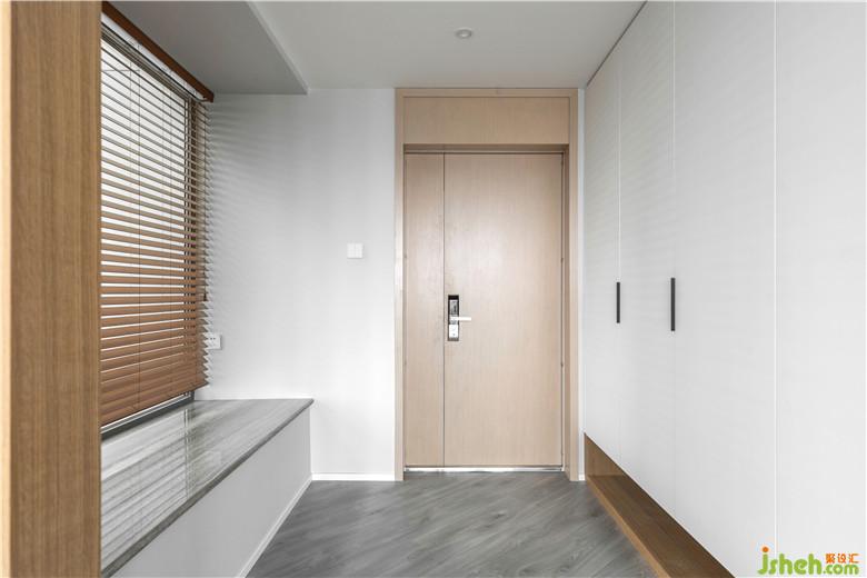 室内设计师入户打造整面透气的木质百叶窗与大面积衣帽鞋柜形成体量的对比,白色+灰色+木色的交织融合营造干净利落的入户空间。