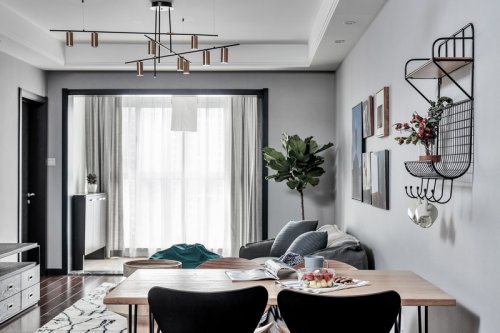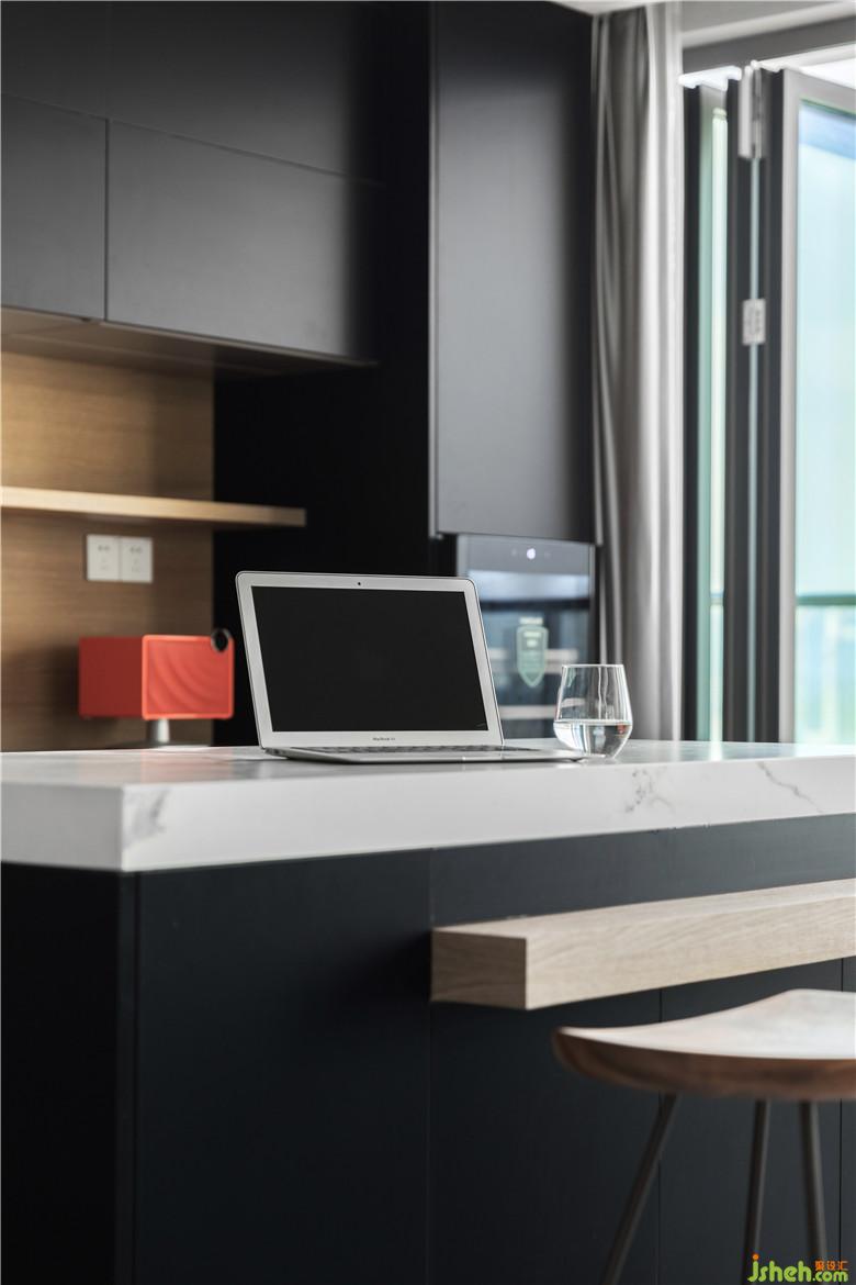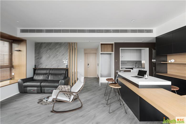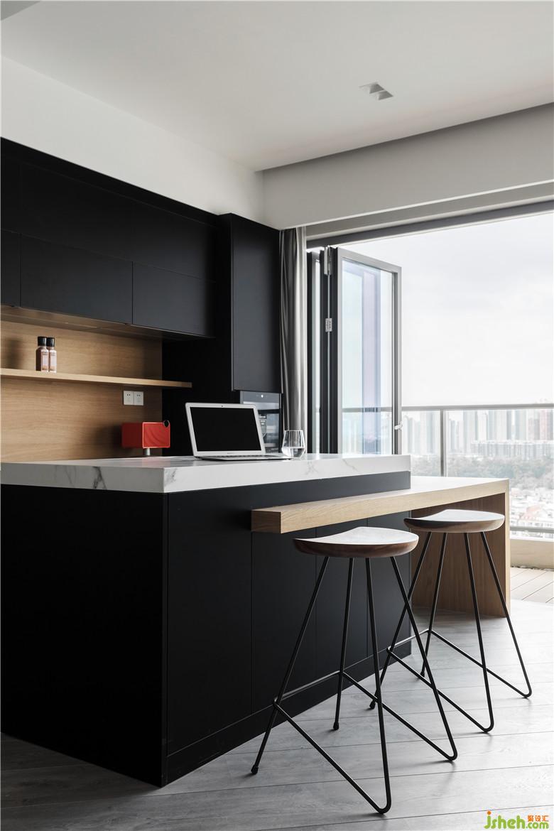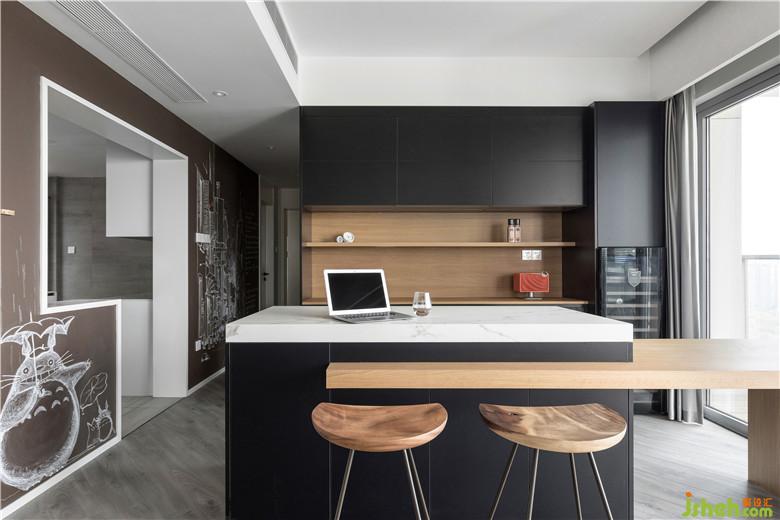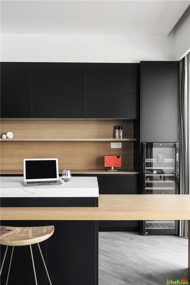 回归生活,放下忙碌,约二三知己,小酌数杯,分享属于在家可感受到的宁静与惬意;室内设计师使用中岛的黑色与木色搭配直接碰撞,太多会比较生硬,咖啡色黑板墙的位置以及面积都起到一个中和作用,它不仅承上启下,也包容着硬朗的黑白灰之间撞入一份木色暖意,不凝重却足够有血有肉。