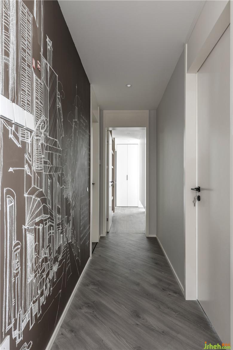 设计不是完成,也不是仅仅在做好看的设计;人与空间的距离,现在,将来的体验感受,会有什么样的变化,都是室内设计师不断在思考与精进的课题。小伙伴们亲自手绘的黑板墙画从厨房外墙这头一直延伸到通道那头,撞破小空间的门扇规律,自由更换不同的通道场景,很期待新生命小小周未来在这里天马行空的写写画画搞创作,现在由新晋父母的周先生与周太太暂时经营。