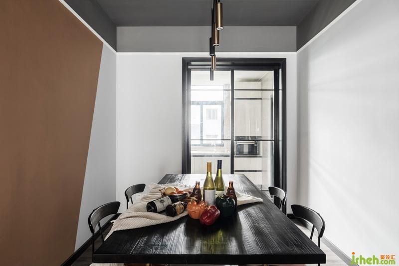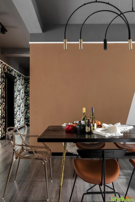餐厅有一定的局限性,既是动线通道,又是功能区,我们将左右墙面进行了颜色区分的视觉引导,太妃糖褐色是介于棕褐色与沙漠色之间,黄度减弱,又不至于过红,是复古中性色的一员,有一种轻熟的优雅,并带有一种视觉温暖,沉郁醒目的同时也毫不张扬,墙面褐白相搭,缓解了往常的单一疲劳,亦将通道与主墙体进行不动声色的区分。