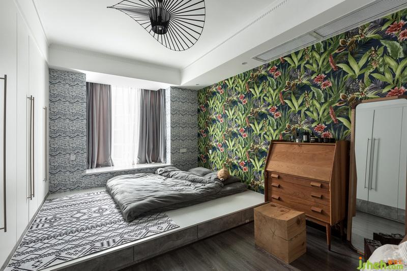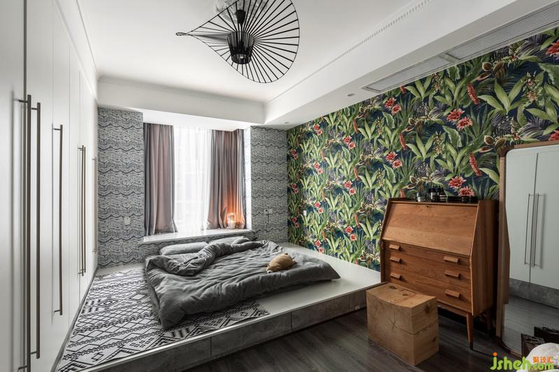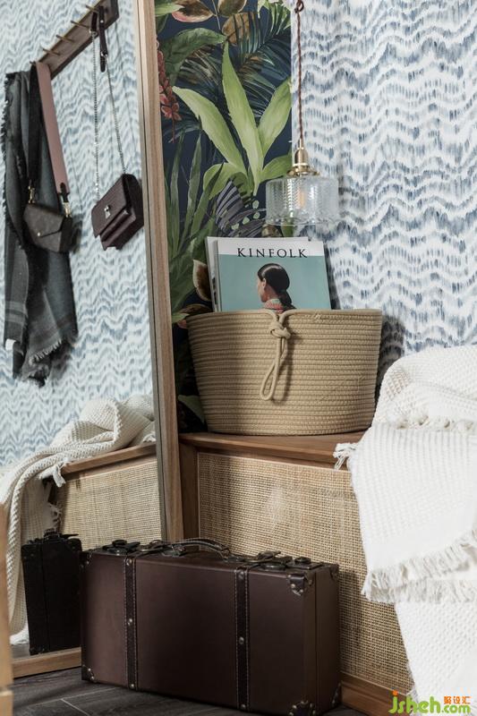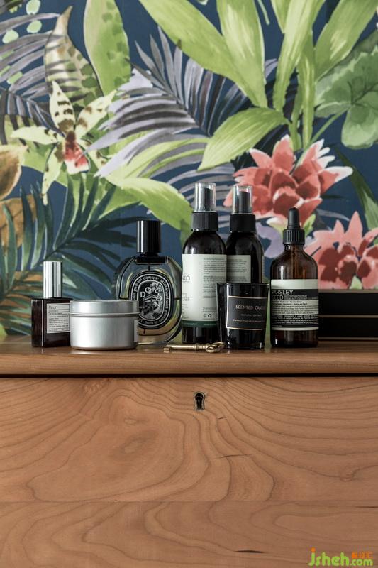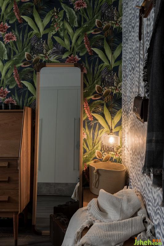 植物墙纸延续了客厅的丛林感觉,温润的樱桃木在材质上将其打破进行对比。