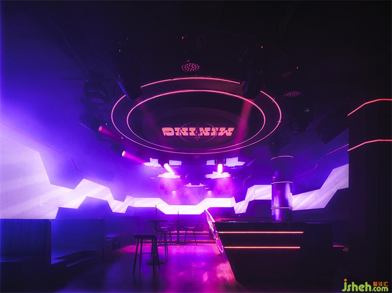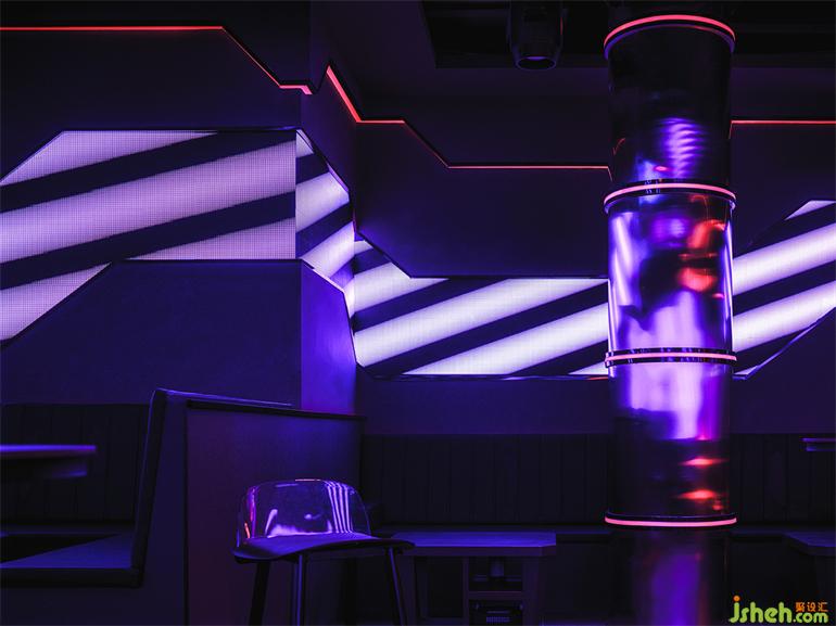 俱乐部设计可折叠的墙面,赋予了空间更多可能性。墙的另一面是舞池区域及卡座区,舞池区被卡座区包围,但通过连续统一的LED墙面形成了大开放的空间氛围。空间中部为DJ台,圆环LED灯带设计聚焦空间视觉焦点。
