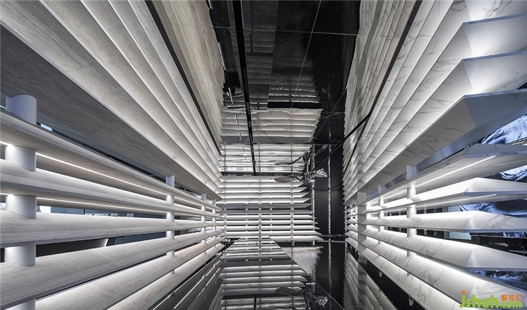 The ink-colored building stands still in the surrounding irregular mapping waterscape, and what makes people stop and watch is the freehand brushwork revealed from the wide windows: the layers of parallel lines are the background, the flexible water ripple texture is an ornament to space, and a long case is used to bring out the theme.