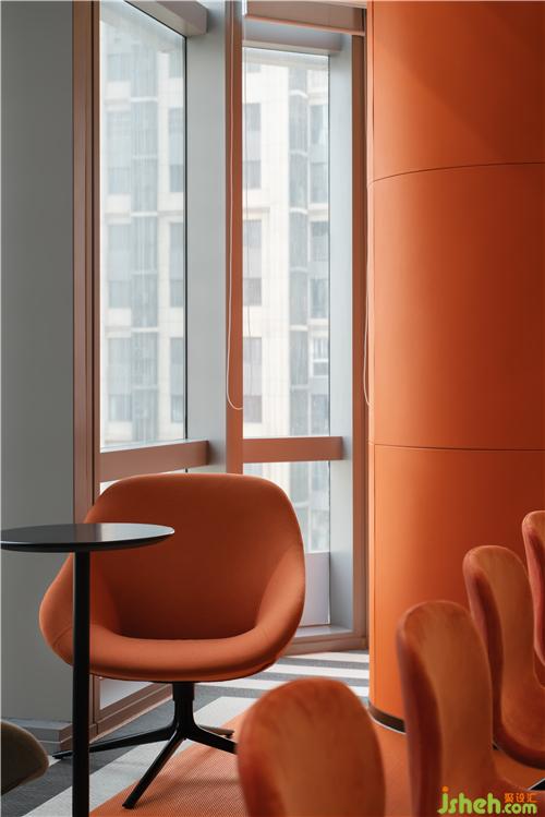 ▼共享休闲区嵌入橙色元素,让空间充满活力,打破办公的沉闷