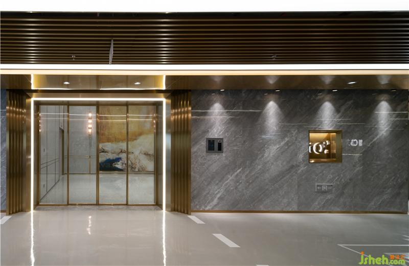 ▼停车场设计通长的深灰色墙体与天花金色不锈钢格栅 Long dark gray wall and golden stainless steel ceiling