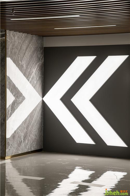 在车马厅的灯光设计中,除了照明需求的满足之外,我们选择的昭示性很强的大发光字和大箭头,在与较暗的车库空间发生对比的同时也可以作为导视,提醒业主在有发光字的位置是车马厅的入口。
